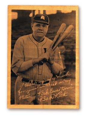 The Bambino expresses gratitude for support of his new film. Great photo on card stock is printed with the Babe's writing, and reads, "I thank you very much for your interest in my picture, "Babe Comes Home," Babe Ruth." Several horizontal creases from having been folded, but appear-ance is fantastic.