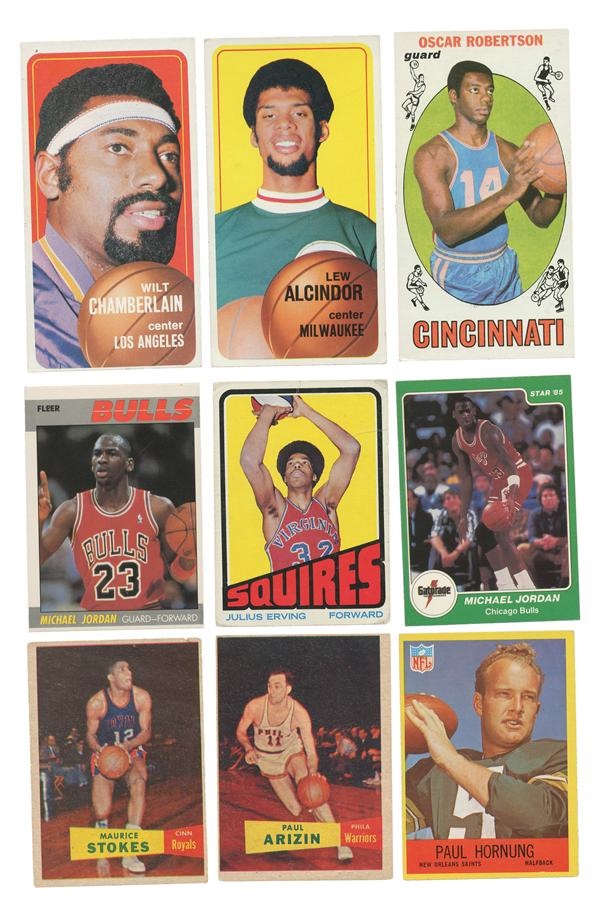 A shoe box collection that features primarily basketball Highlights includes 1957 Topps basketball (6) Including #10 Arazin EX and #42 Stokes. Other highlights: 1987 Fleer Basketball Set NRMT, and loads of 1970s stars including Julius Erving, Wilt Chamberlain, Pete Maravich and more. The football portion of this grouping has names like Paul Hornung, Don Meredith and Herb Adderly throughout. There is also a partial 1974 set included. Overall, both groups average EX-MT with the older cards being about EX and the newer cards being better. Tons of breakdown value.