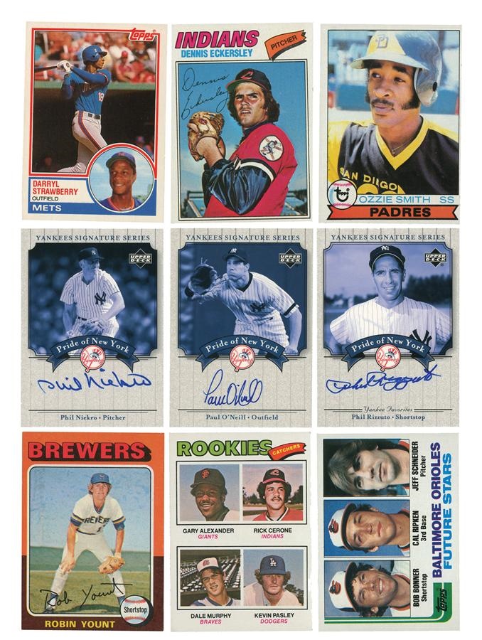 This collection contains 32 Signed 2003 Upper Deck Yankees Signature Series cards including Rizzuto, O'Neill, & Niekro. Other cards include 1975 Yount EX, 1979 Ozzie Smith Rookie EX-MT, 1982 Cal Ripken Jr. NRMT and more.