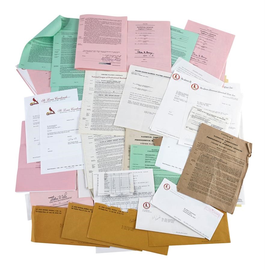 A lifetime in baseball, all on display in the form of paper and ink. That's what you get with this Red Schoendienst contract collection as the slick-fielding, Hall of Fame second baseman spent over half a century as a player, manager and coach, primarily with the St. Louis Cardinals. Nearly every one of these legal pacts was signed by Red, most using his legal first name of Albert. It all commences in 1942 at $75 per month playing for the Union City minor league club. Then it's off to the Rochester Red Wings in 1944, then to the St. Louis Cardinals, where he won his first World Championship in 1946. Next up, the fabulous 1950s in St. Louis and onto New York with the Giants in 1956=57. His years with the Milwaukee Braves are missing here, but his return to the Cards in 1960 is documented. In 1962, Schoendienst began coaching as well as playing so there are two contracts - one for player, one for coach. Then onto coaching the 1964 World Championship team, and managing the 1967 World Champions. There are also agreements reflecting his two-year coaching stint with the A's in late 1970s, as well as yet another return to the Cardinals in 1979. From there until present, Red has been with the franchise as a coach and special adviser, helping to guide them to more titles. There is a gap between 1998 and 2007, but aside from that and the few Braves years in the late '50s, this is a near-complete run of Red's contracts. Please note that the social security numbers have either been blacked out or have a sticker over them. The collection also includes correspondence between Red and the teams in question, as players back in his heyday actually negotiated their own contracts. Releases, supplemental contracts and paperwork are also included, with some duplication due to contract renegotiation. The average condition is EX, with typical mailing folds.