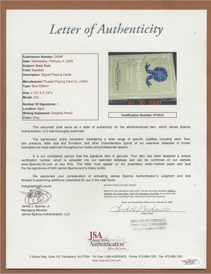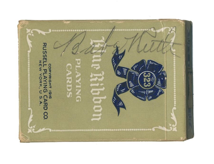 Babe Ruth was a player in every sense of the word. On the baseball field. With the ladies. And at the poker table, if this signed deck of cards is any indication. The Blue Ribbon-brand deck is copyright 1916 and in EX condition and features "The Bambino's" signature in pencil that rates 8 out of 10. The story behind this card set is shrouded in mystery as it is unclear whether Ruth autographed it at a poker Game. Comes with an LOA. While playing for the Red Sox in his third major league season, Ruth led the American League with nine shutouts and a 1.75 ERA. So he may have been an ace who played a few aces as well.
