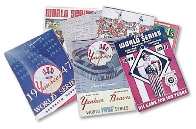 It's a stack of October glory here for the bidding with this grouping of publications from Championship towns. 1939 Reds signed by Rausch and Landis , 1947 Yankees, 1950 Phillies, 1957 Yankees, 1962 Giants (2), 1970 Orioles, 1970 Reds, 1972 A's, 1972 Reds. Also here is a 1959 All-Star Game program and a stub for Game Six of the 1930 World Series. Programs average EX; ticket is EX with vintage ink writing on front.