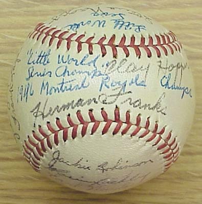 From a teammate of Jackie's on the 1946 Royals. Twenty-one signatures on this Official International League baseball. Includes Jackie Robinson (mint), Campanis, Dixie Howell, Lew Riggs, and more. Herman Franks and Clay Hopper on the sweet spot. Ball is notated in vintage ink on the sweet spot, "Little World Series Champs 1946 Montreal Royals." NRMT. 1982 three-page letter of authenticity from Dixie Howell who sold this baseball to Barry Halper. Great content is a col-lectible unto itself. Ex-Barry Halper Collection.
