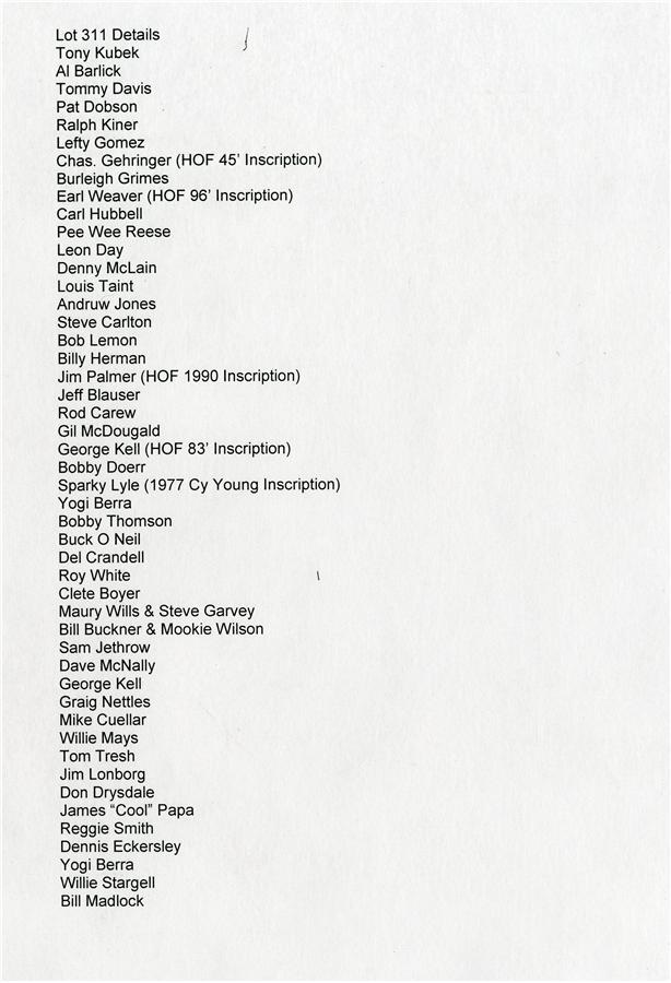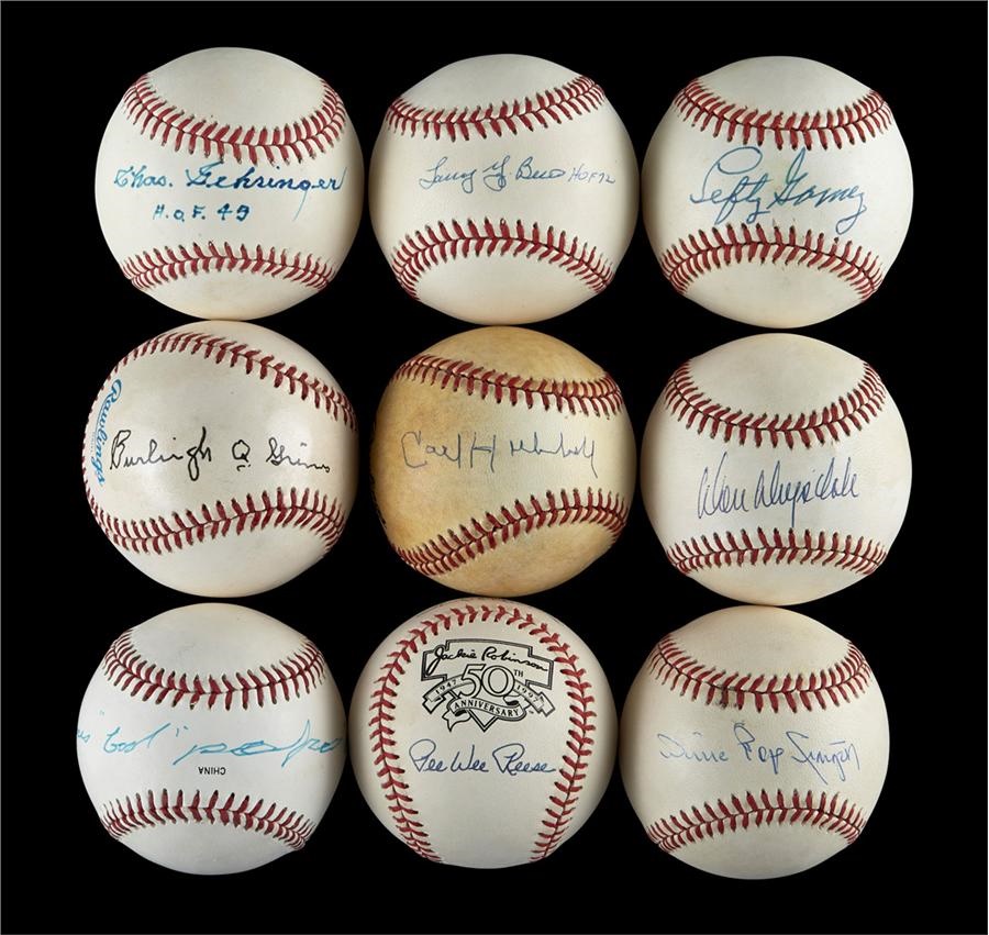 Some special baseballs here for collectors, with some bearing inscriptions. Here are some of the choice items: Carl Hubbell, Cool Papa Bell, Willie Stargell, Burleigh Grimes, Lefty Gomez, Yogi Berra, Don Drysdale, Pee Wee Reese (on a Jackie Robinson 50th Anniversary ball) and a Charlie Gehringer, inscribed: "H.O.F. 49." The balls average EX-MT to NRMT condition with some toning, while the signatures rate 8/9 of 10.