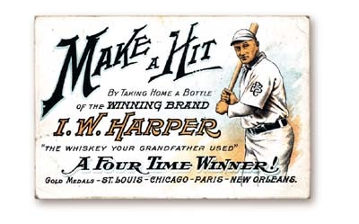 This rare trade card features a color sketch of HOF'er Wagner in uniform with bat in hand. The 1912 National League schedule is printed on back, with the wording, "Make a hit by taking home a bottle of the winning brand I.W. Harper - The whiskey your grand-father used" on the face. Although Wagner didn't allow his image to be used on the T206 tobacco card, he apparently had no problem with it being used on a whiskey advertisement. There are a few heavy creases down the middle and some toning on the back that bring the overall grade to VG. Ex-Halper collection.