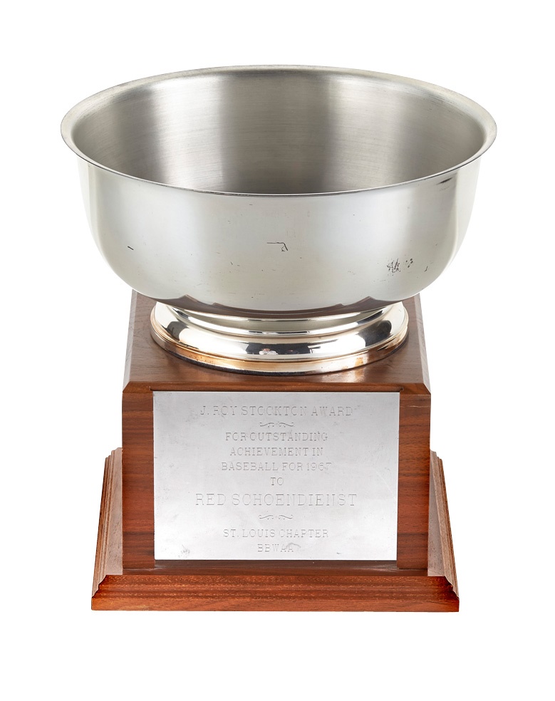 In just his third year as a big-league skipper, Red Schoendienst led the Cardinals to a World Series title over the Boston Red Sox. And for that achievement, he was awarded the J. Roy Stockton Award by the local chapter of the Baseball Writers Association of America. Here's Red's trophy, which stands nearly 10" tall and nearly 9" wide. The plaque on the front reads: "J. ROY STOCKTON AWARD FOR OUTSTANDING ACHIEVEMENT IN BASEBALL FOR 1967 TO RED SCHOENDIENST ST. LOUIS CHAPTER BBWAA." The trophy is in EX condition. J. Roy Stockton was an American sports writer who covered the St. Louis Cardinals from 1915 to 1958, primarily for the St. Louis Post-Dispatch.