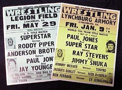Long before the Hulkster, Stone Cold Steve Austin and the Rock, the Lynchburg (Va.) Armory was drawing big crowds with posters like the twenty-five that we have accumulat-ed here. Bold and colorful boxing style broadsides on heavy stock feature guys like Roddy Piper and Ricky Steamboat. Condition is great overall. Also here are a few dozen handbills and programs and other publications fur-ther documenting the early days of this wacky pseudo-sport. VG-EX overall.