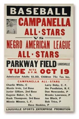 Out of this world cardboard sign is right out of Parkway Field, Louisville. Great image of Campy looking skyward takes its place in the upper left hand corner, while at bottom such greats as Irvin, Minoso, Newcombe and Black are list-ed as "Campanella All-Stars." Once folded in quarters, leaving quite even and rather unobtru-sive folds. Appearance is much better than the technical VG-EX rating. (22x14")