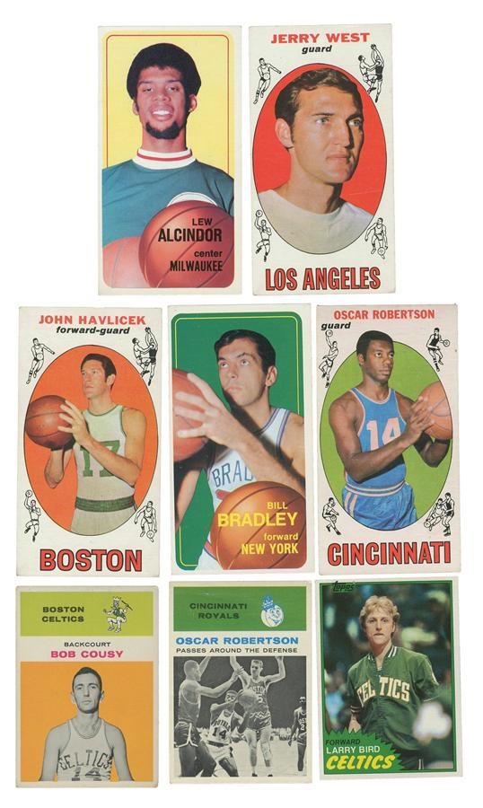 A shoebox collection of basketball cards that includes 1961Fleer (2) #10 Cousy EX, 61 Robertson IA VG Crease. 1969 Topps (105) #20 Havlicek (4) EX, VG-EX (2) VG, 35 Baylor EX-MT, 50 Robertson VG. 90 West EX, 1970 Topps (17) #7 Bradley EX, 13 Riley PSA 6, #75 Alcindor EX-MT,  #160 West EX. 1981 Topps #4 Bird NRMT.