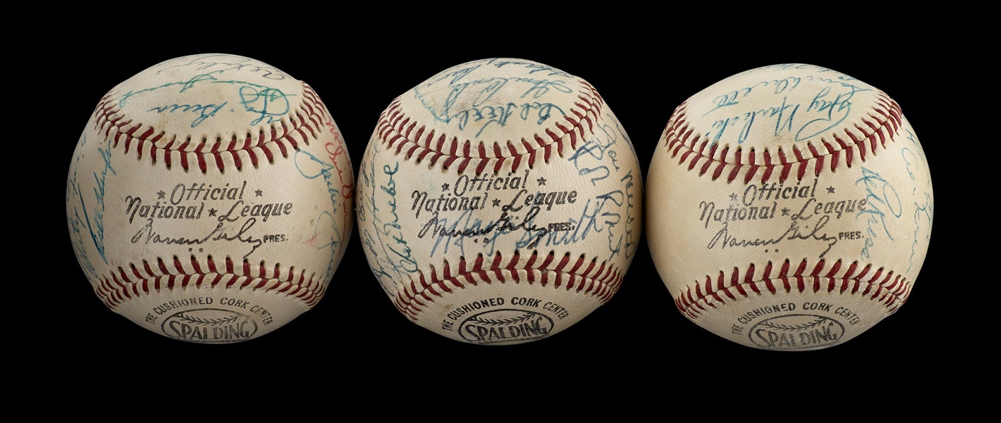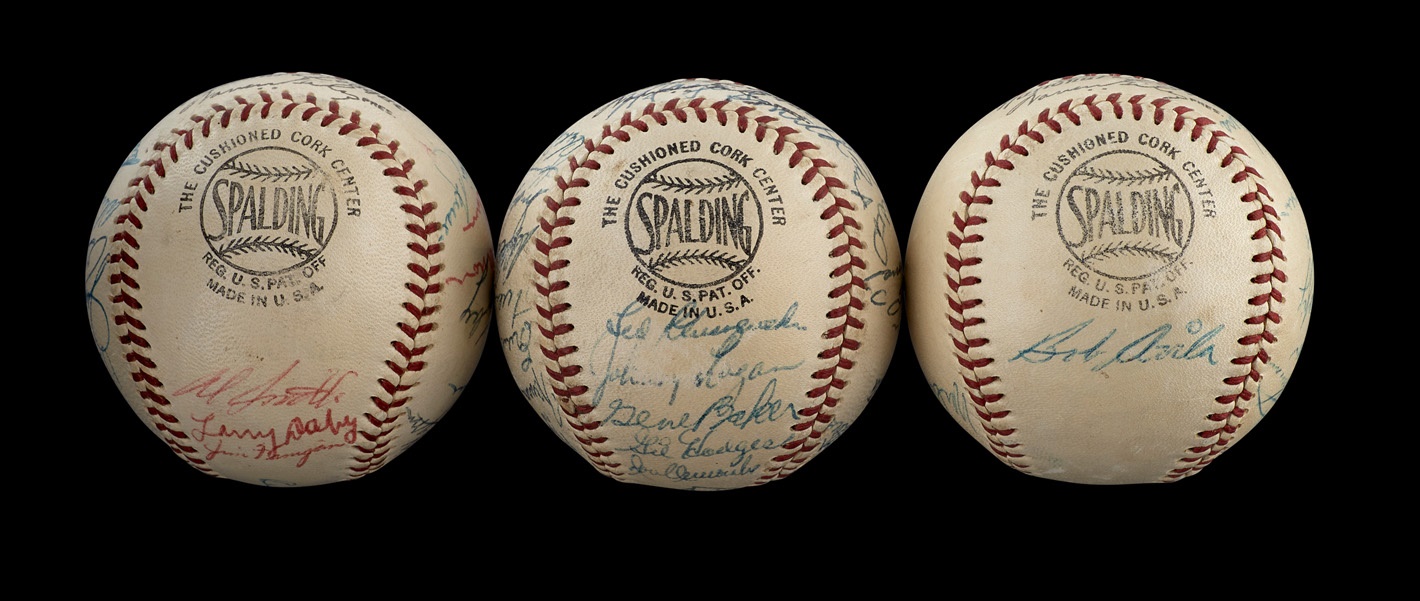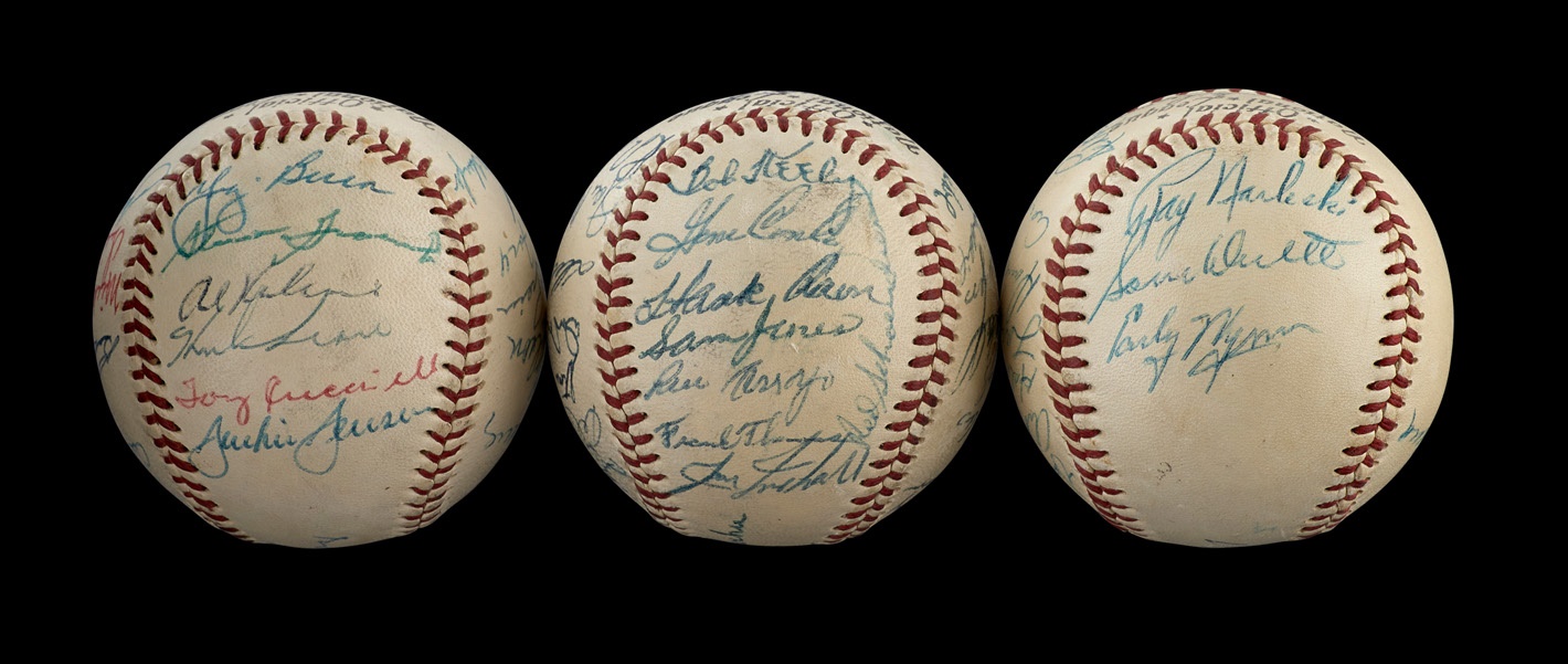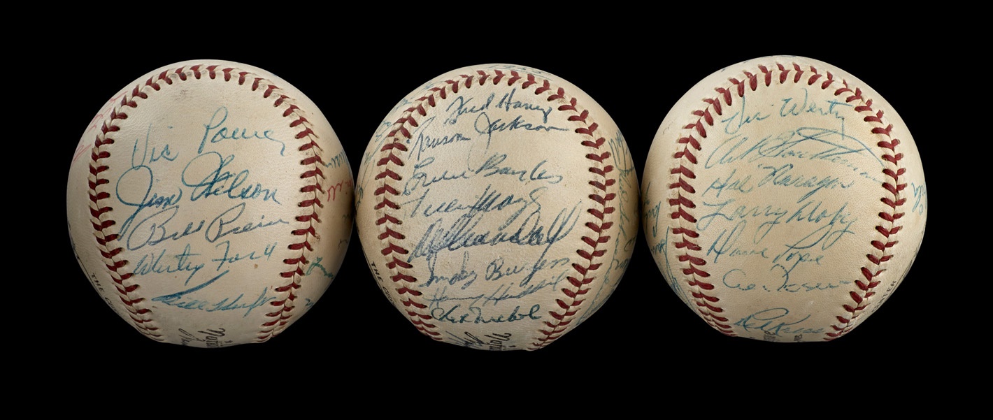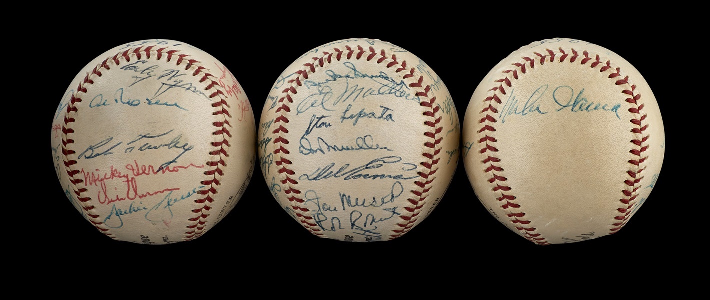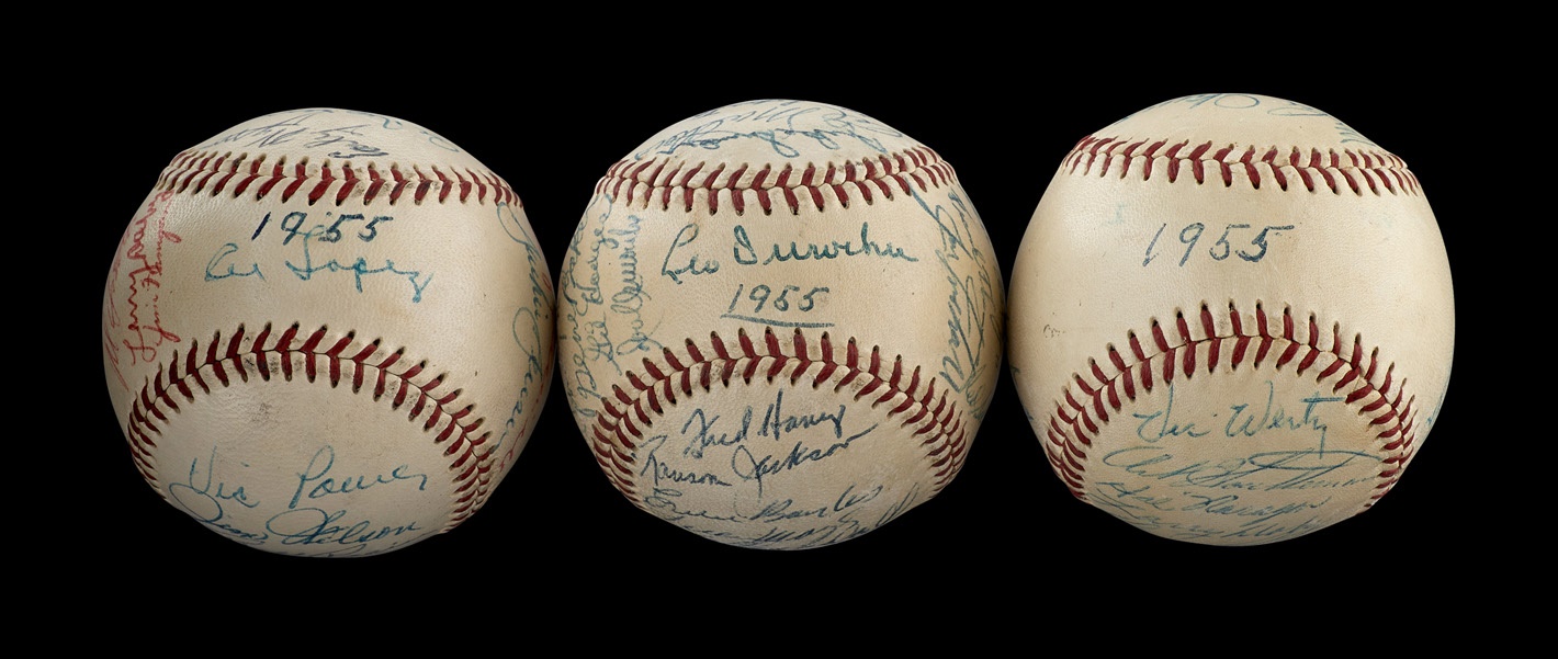 The National League orchestrated one of the greatest comebacks in All-Star Game history in 1955, erasing a 5-0 deficit in the bottom of the seventh inning before defeating the AL, 6-5, in 12 innings. There are 30 National League All-Stars who signed an EX-MT ball, including Durocher, Kluszewski, Hodges, Aaron, Schoendienst, Haddix, Haney, Mays, Musial, Snider, Mathews, Banks and Roberts, Signature strength is 8/10. The AL ball boasts 21 signatures, including Ford, Lopez, Wynn, Jensen, Rosen, Doby, Kaline and Berra. It is in EX-MT condition and the multi-colored signatures average 7.5/10. Both are official National League (Giles) baseballs. The Indians ball is NRMT with 8/10 signatures including Wertz, Doby, Wynn, Garcia and Rosen. The '55 Tribe finished in second place with a sterling 93-61 record.