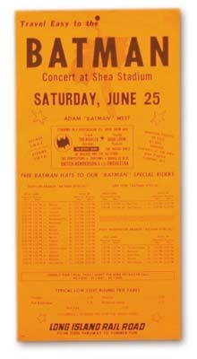 A rock-em, sock-em, spe-cial poster from the Long Island Rail Road advertising the Batman concert at Shea Stadium with The Temptations, Young Rascals, Chiffons, Jr. Walker, Frank Gorshin, and the Batusi Girls on June 25, 1966 and announcing the addition of many extra Batman Special Trains to the show, "Free Batman hats to our Batman special riders." EX-NRMT.