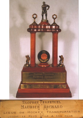 The puck used to score the Rocket's 543rd NHL goal (including playoffs) sits atop this tower-ing vintage perpetual trophy, donated by Maurice Richard to the Montreal "Transportation Hockey League" to be awarded to the league's most valuable player. The puck itself is an old double-sided Art Ross Tyer gamer from the period with attached bronze plates engraved with Maurice's facsimile signature and "543". Plaques at the base of the trophy list the names of the winners from beginning in 1957 through 1963. The trophy does show its age and the gold-en player at the pinnacle is missing his stick, otherwise in excellent condition. From the collec-tion of the last player to win the award. An amazing find!