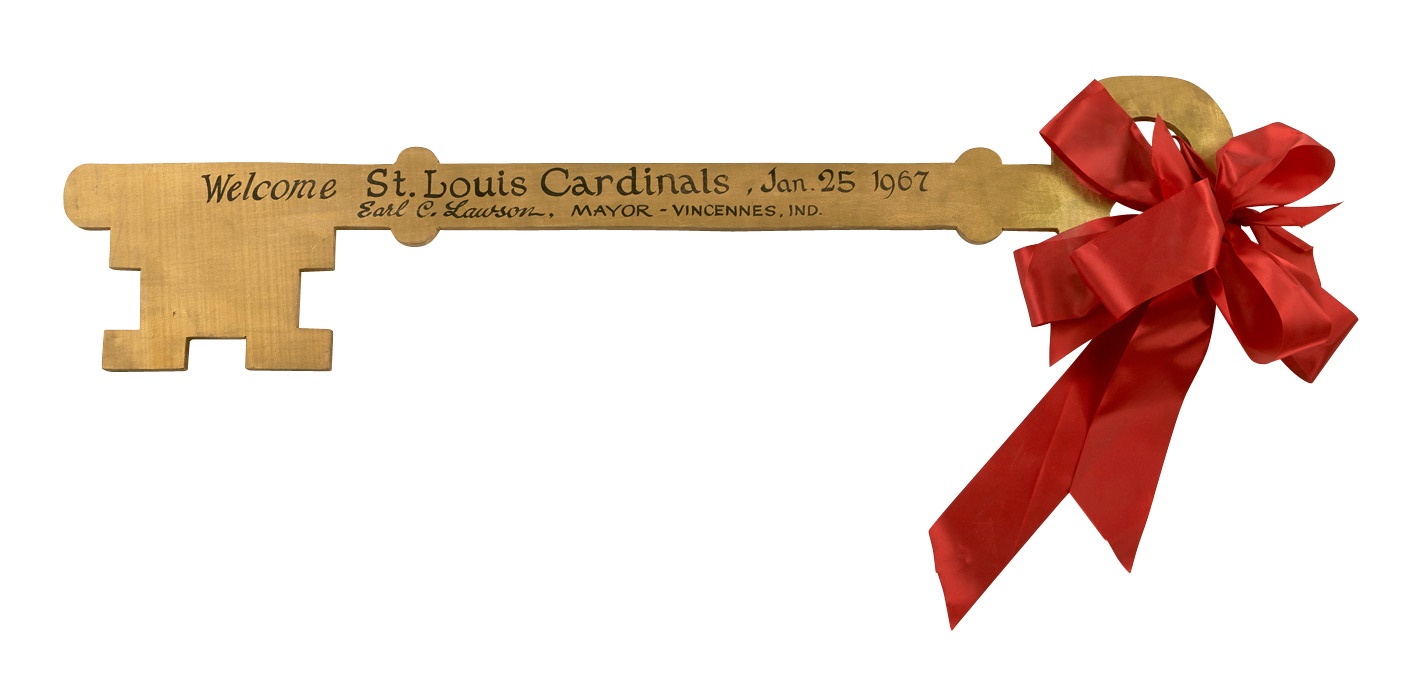 Call him the "Keymaster." Cardinals legend Red Schoendienst was immensely popular in the Midwest across the decades. So much so that he was bestowed the keys to several cities and towns. The largest of the set is a 40"-wide wooden key from the mayor of Vincennes, Indiana that was handed to the skipper of the eventual World Champion Cardinals prior to that memorable season and is still adorned with a red bow. There are also two from Jackson, Tennessee and one each from Creve Couer, Missouri and Progress, Illinois, all of which are brass. All five door-openers are in EX condition.