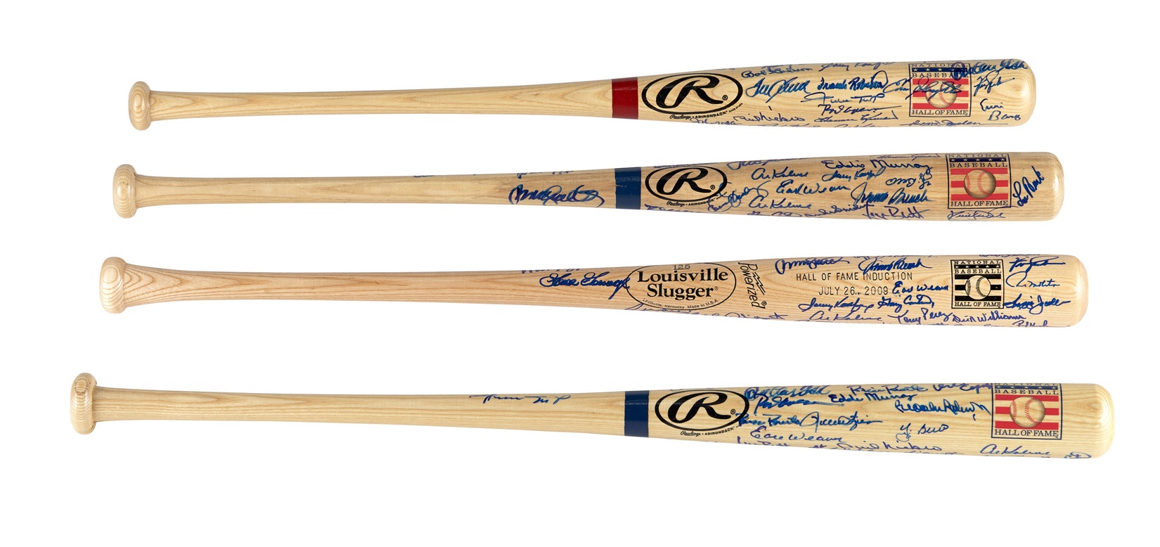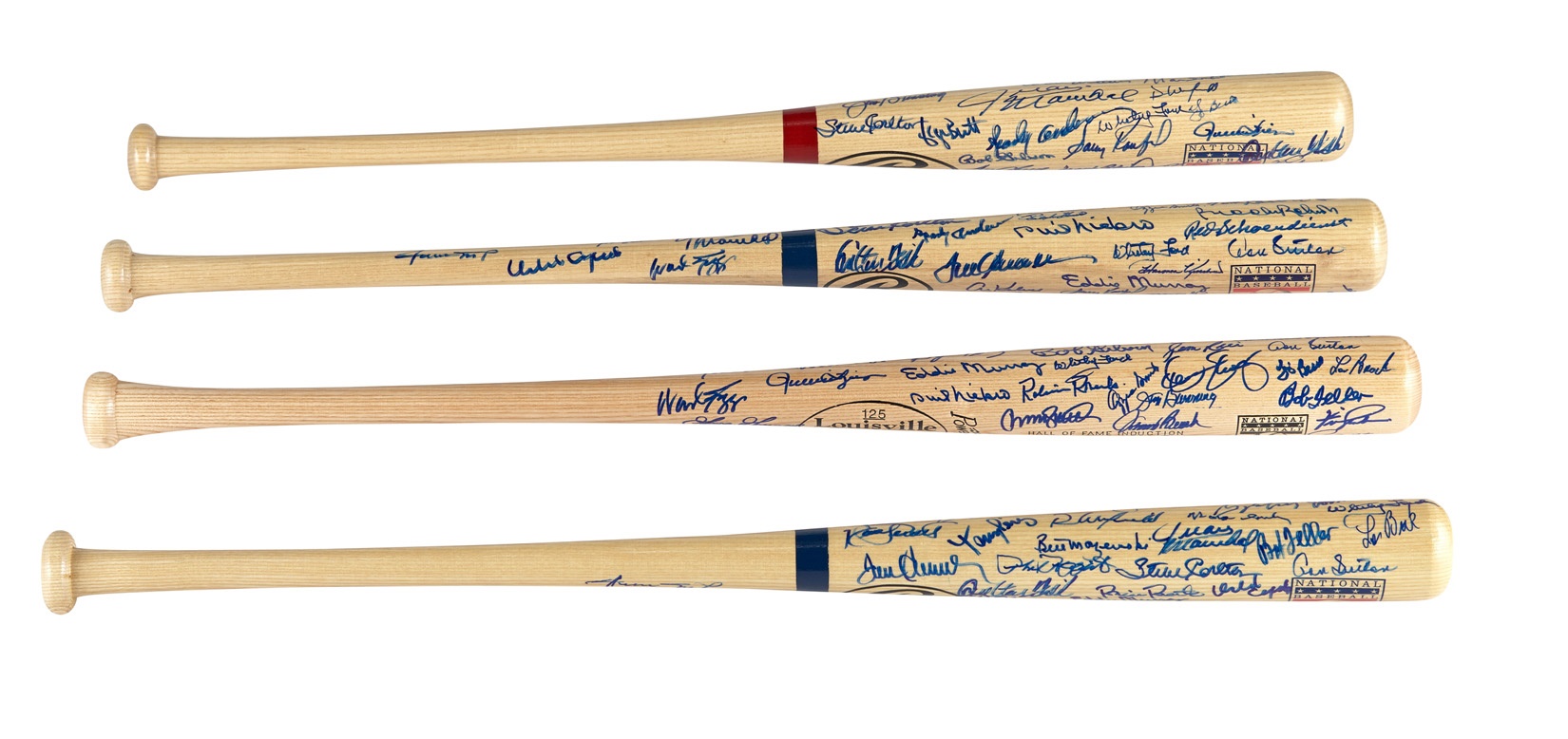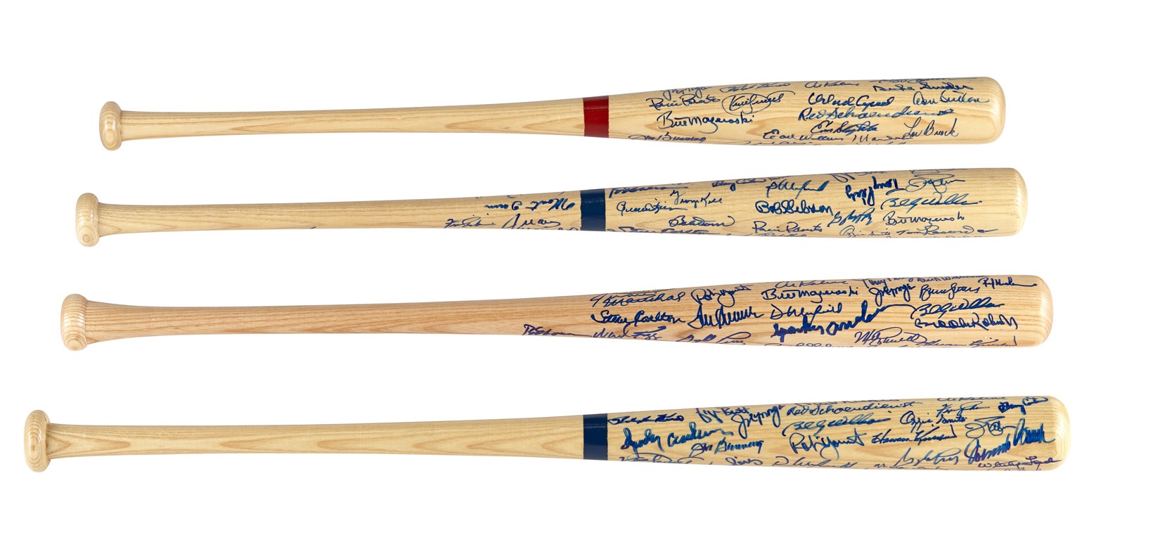 Feel like a Hall of Famer with this quartet of special bats that were exclusive to the Cooperstown elite. They come from Hall of Famer Red Schoendienst and represent different years. Among the legends who signed: Mays, Carlton, Schoendienst, Yount, Killebrew, Puckett, Seaver, Rizzuto, Murray, Carter, Fisk, Sandberg, Bench, Carew, Boggs, Ford, Mazeroski, O. Smith, Koufax, Brock, Kaline, Gibson, Weaver, Carew, Schmidt, Feller, B. Robinson, and many more. Every name is a Hall of Famer and several appear on all four bats. There are approximately 40 signatures on each, averaging 8-9/10. The bats are NRMT.