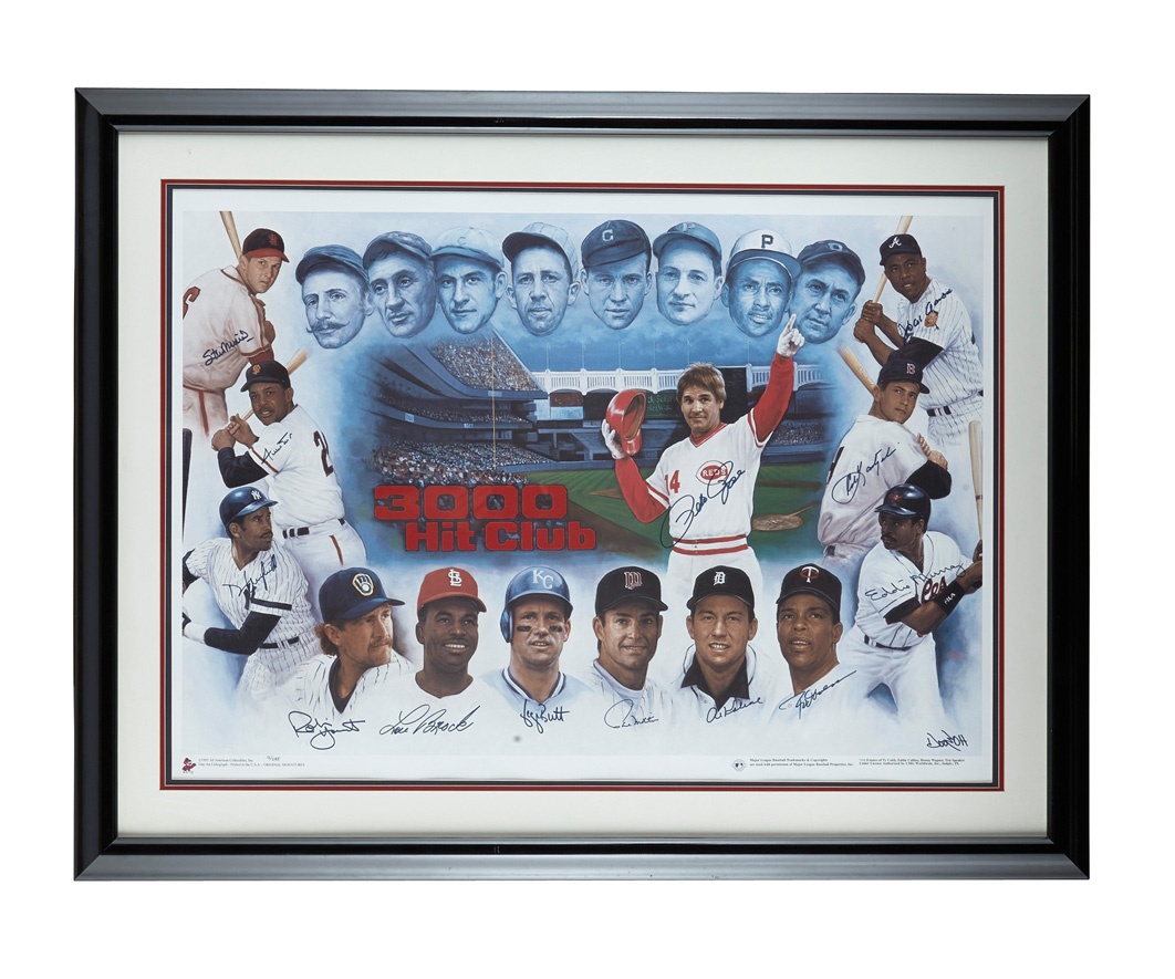 Nearly half of baseball's prestigious 3,000-Hit Club signed this 47" x 37" litho: Mays, Musial, Yount, Winfield, Brock, Brett, Molitor, Kaline, Carew, Murray, Rose, Aaron and Yastrzemski. The limited edition print, which is signed by the artist, is a nice low number - 12 of 285, It is in NRMT condition with signatures averaging 9/10. Cap Anson initiated the club back on July 18, 1897, while Derek Jeter is the most recent member, homering for #3,000 on July 9, 2011.