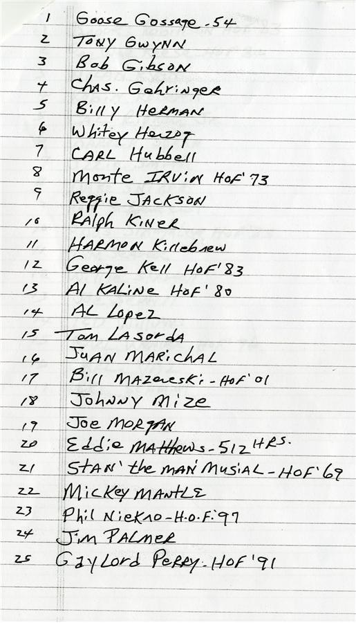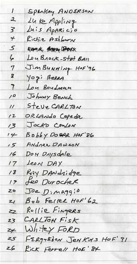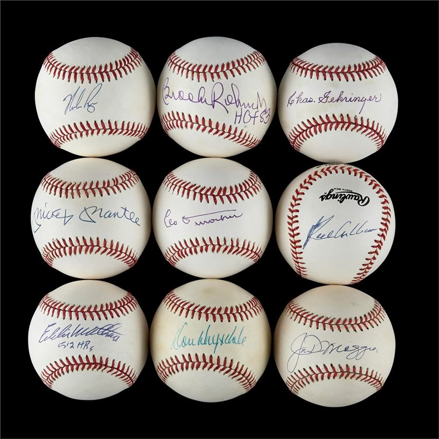 This is great start to collecting Hall of Fame signed baseballs. All 68 are different and most are on official National or American League baseballs. The collection includes a number of deceased players and inscriptions. Included are: Appling, Ashburn, Bench, Conlon, Drysdale, Day, Dandridge, Durocher, J. DiMaggio, R. Ferrell, B. Herman, Hubbell, Killebrew, Lopez, Mathews, Mantle, Reese, Ryan, Spahn, Stargell, Sewell, T. Williams, Schmidt, Yaz, and many more. Please call for a complete list. The balls average EX+ with some having toning and the signatures averaging 7-8/10. Most of these signatures were obtained in person.