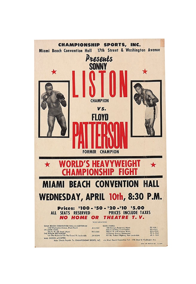 Sonny Liston and Floyd Patterson were scheduled to fight their second rematch on April 10, 1963, but it was postponed until July. Liston prevailed again, knocking Patterson out in the very 1st round. Offered here is a scarce, original, on-site poster for the postponed date. This cardboard poster pictures the fighters and has creasing, edge and corner wear, as well as tape in the corners. Overall VG condition. 14" x 22."
