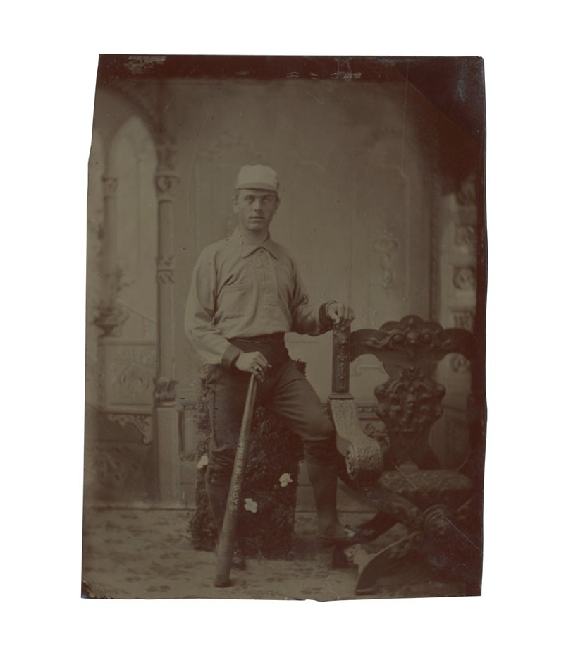 From the early days if baseball comes this terrific tintype of an 1880s-era ballplayer dressed in a high-collared, lace-up jersey, white hat, knickers and socks. The bat he's holding reads: "Sheb'n Boys," which is almost definitely an abbreviation for the Wisconsin city of Sheboygan. The image is clear and clean, with some minor creasing. It does not come with a frame of any kind. It measures roughly 3.25" x 2.5". EX condition overall.