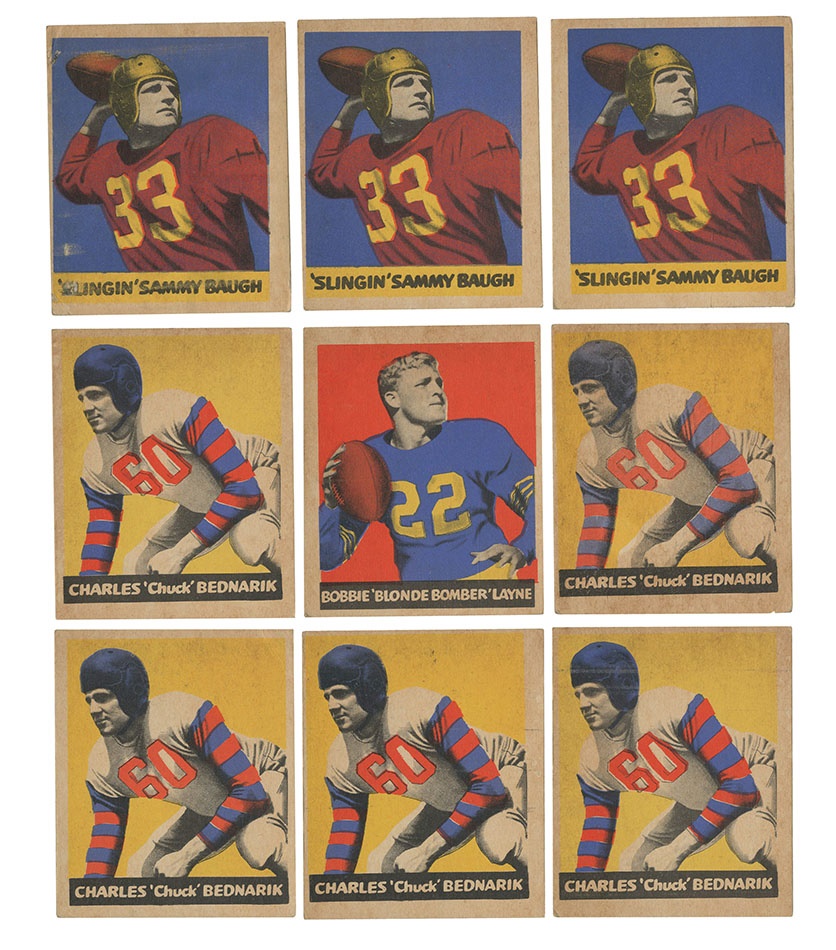 Leaf's Second offering in 1949 closely resembles its 1948 counterpart utilizing the same players and photos. This group Is Highlighted by: #134 Bednarick (5) all EX, Baugh #26 (3) Ex-MT, EX, GD, Bobbie Layne #67 (2) Ex-MT, GD. The rest of the group consistently averages EX throughout.