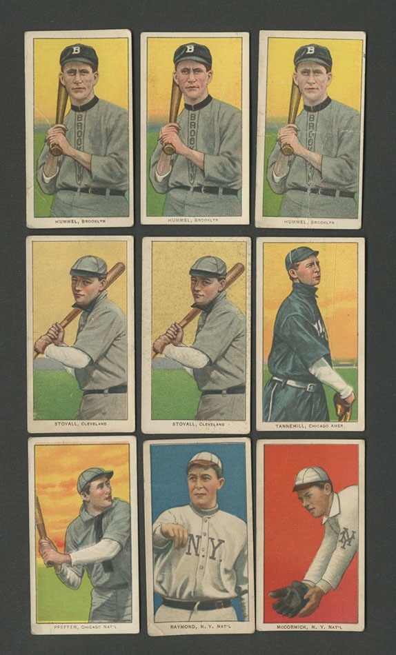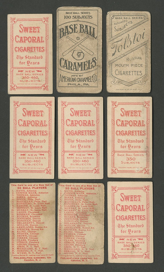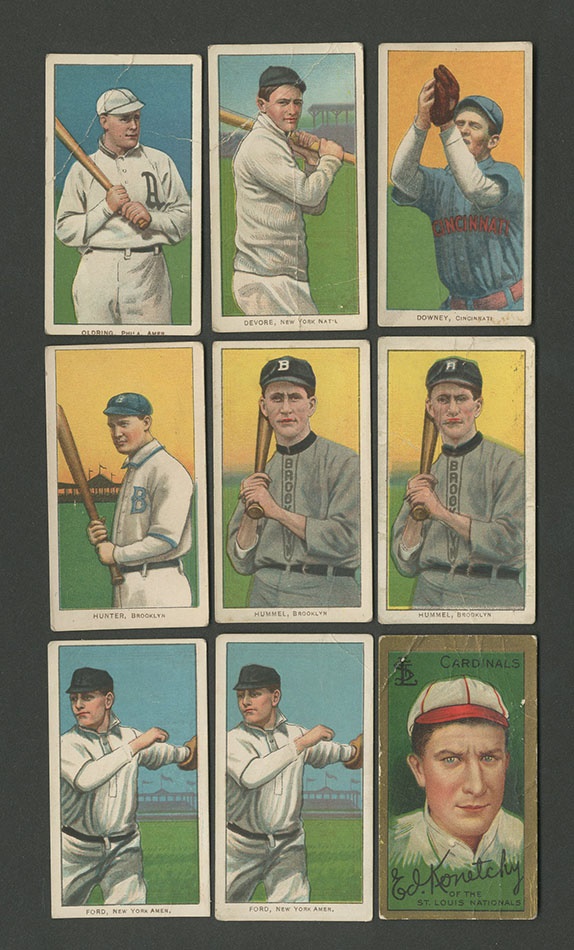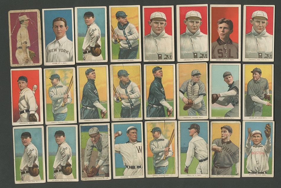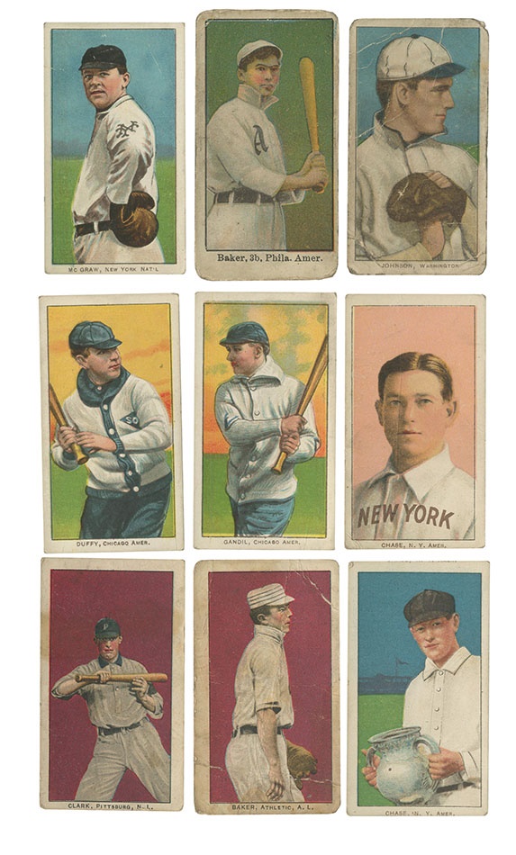 Estate group of Tobacco and candy cards. They include:American Caramel Frank Baker VG, E96 Philadelphia Caramel Baker (2) PR, PR, Clark VG, T205 Konetchy PR, T206 (46) Key Cards: Chase Pink VG, trophy VG-EX, portrait EX, Duffy (3) VG-EX, VG-EX, PR, Gandil (3) VG-EX, GD, PR, Johnson PR, McGinnity GD, McGraw hand on hip (4) VG-EX, VG, GD, PR. The rest of the T206 collection averages VG+ with only a few lesser.