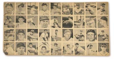 There are 36 cards on this sheet. The sheet has been torn in half but then taped back together. This sheet grades Good. The bottom left has the corner torn off. The top left corner is badly creased and actually has been taped back on. The Musial, which is on the bottom right, has a piece torn off of the corner. The sheet has stars such as Yogi Berra, Bob Feller, Warren Spahn, etc.