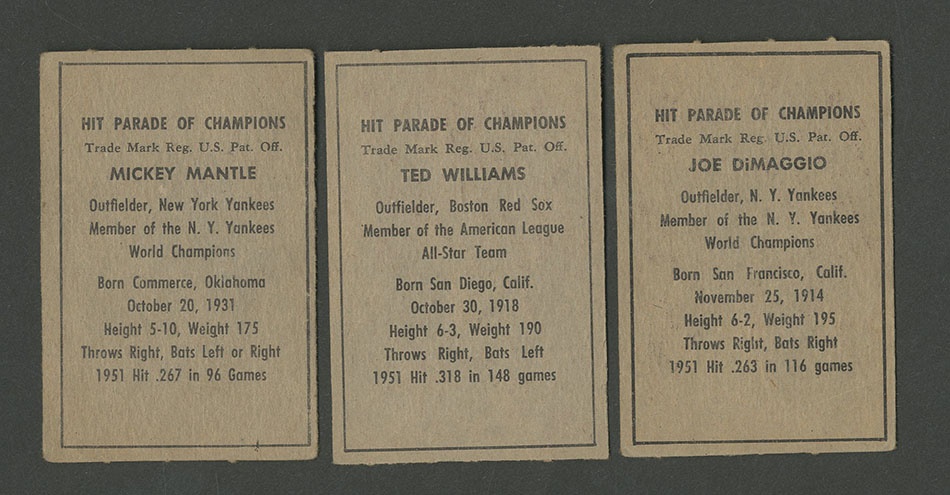 The second issue of Berk Ross featured an all baseball lineup and was issued in packs instead of boxed sets. This lot contains Ted Williams EX-MT, Mickey Mantle VG-EX+, Joe DiMaggio EX, Wrapper VG-EX.