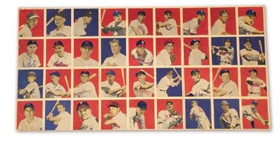 There are 36 cards on this sheet. The sheet technically grades VG. The sheet is still in tact but there are three attempts at cutting the sheet down. It looks as though someone used a razor blade that did not cut quite through in three separate areas. The back of the sheet looks as though it was double printed on. The back looks out of focus because there are two printings on the back of each card. This sheet has stars such as Bob Feller, Stan Musial, Ralph Kiner, Pee Wee Reese, etc. This would make a great addition to any 1949 Bowman Set.