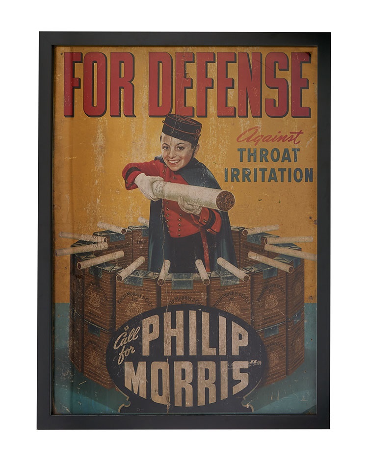 Nothing cures an irritated throat more than a good smoke, huh? Back before surgeon general warnings inking tobacco with cancer, cigarette manufacturers were able to convince the public through clever advertising campaigns that smoking was actually good for you! Here's a perfect example of that mindset: WWII era Johnny the Bellboy character aiming a large cigarette from behind a fortress of Philip Morris packs and other smokes poised as guns. The large, colorful cardboard display measures roughly 34" x 45" but creases limit the condition to VG at best.