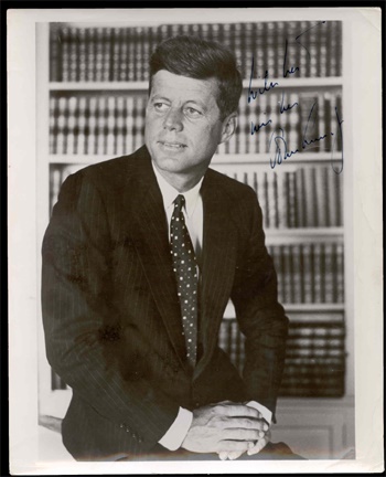 This exceptional signed photograph shows him in his Boston office. The lengthy signature in mint blue ink reads, "With Best Wishes John Kennedy." The photo itself is 8x10" and EX+. Coming from a dearly departed former campaign worker, the photo is the real thing and not secretarial.