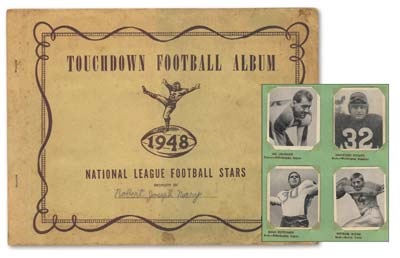 This set, 1-108, is still in the original binder that it was collected in dur-ing the 1948 season. The cards are typically Vg to Vg/Ex with some better/lesser. The cards are all neatly tucked away in pages with all four corners not exposed. The cards are not glued to the pages and they are removable. The #108 card, Buford Ray, is creased and is stained on the bottom right corner. This is a truly unique collectible for all serious football fans.