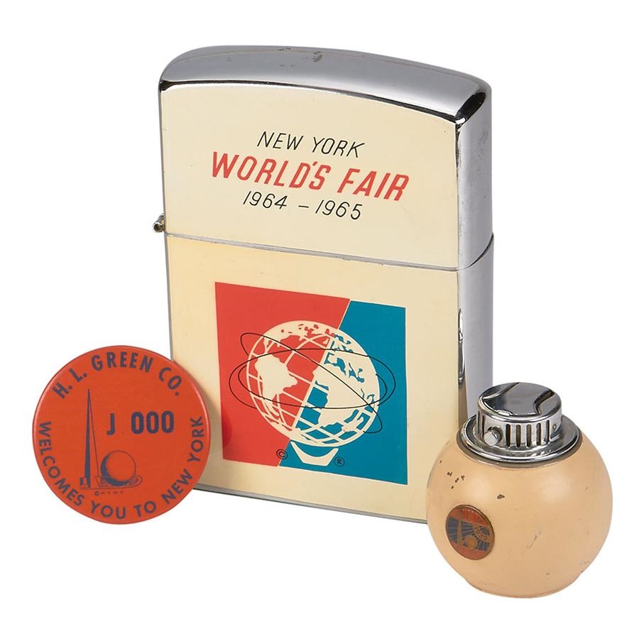 Got a light? You'll never be short on fire with this oversized 1964 lighter that measures 6.5" x 4.5" x 1.5". Its zippo-like style weighs just shy of two pounds and should work with flint. The 2 5/8" tall table lighter from the 1939 World's Fair is stamped chase USA on the bottom and is functional. The rare 2.5" x 2.5 H.L. Green pinback was only worn by the people who worked at the expo, which drew over 44-million people at its Queens, NY location.