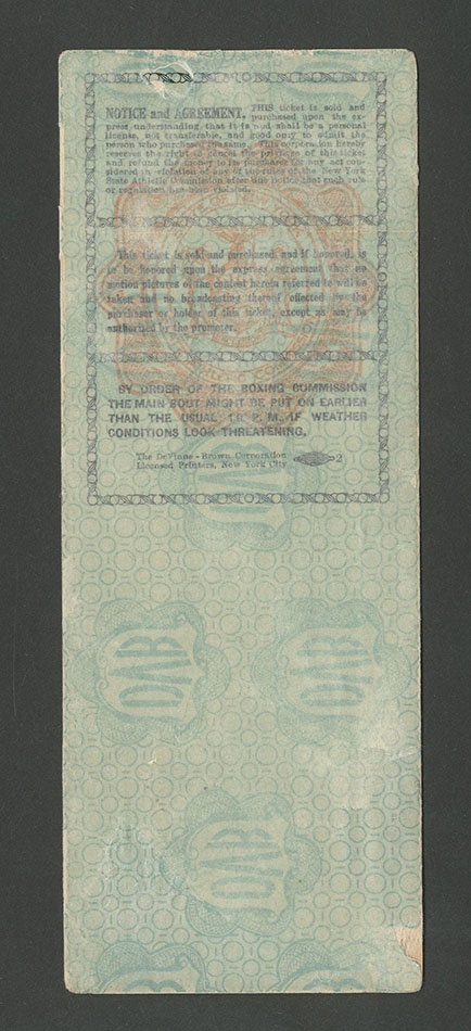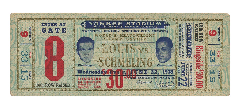 On June 22,1938 at Yankee Stadium in New York Joe Louis met Max Schmeling for the second time. The bout was for Louis' heavyweight title. Louis, embarrassed in their first meeting, won the bout by KO in the 1st round. Presented here is an original full, unused on-site ticket for the bout. This full ticket measures 2 3/4 inches by 7 1/4 inches. The ticket shows edge and corner wear. The back shows wear. Not creased. The front is illustrated and clean. Has a section, row and seat number. One of the most desirable tickets and a must for any boxing collection.