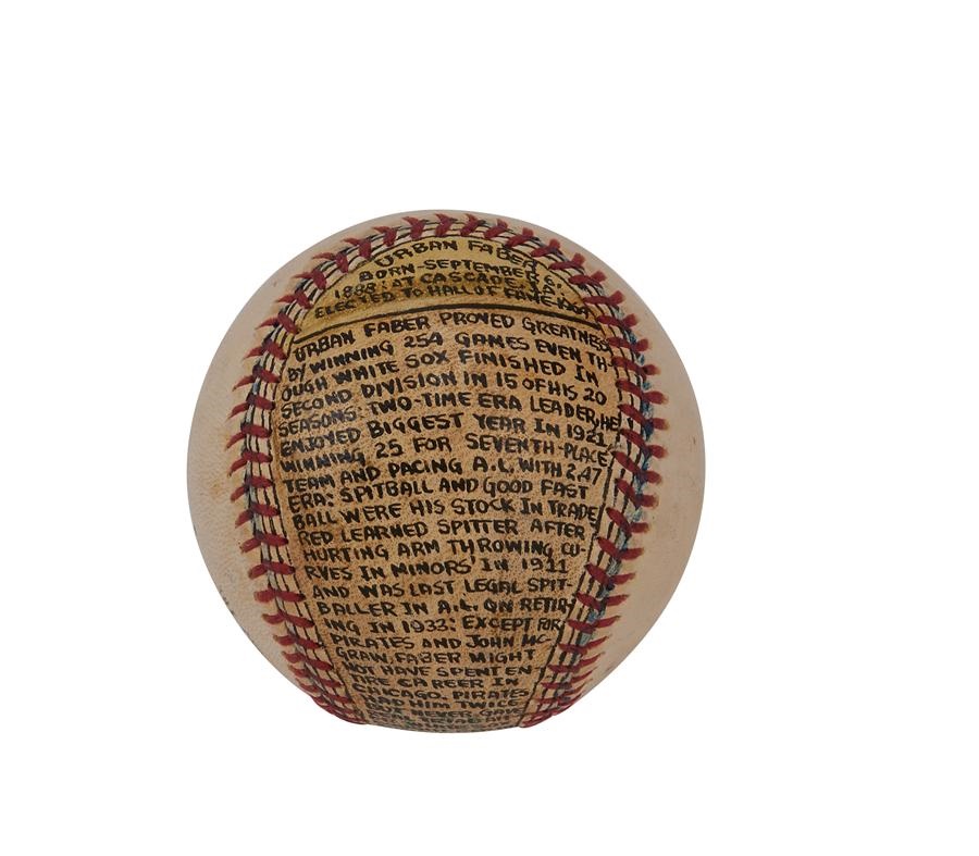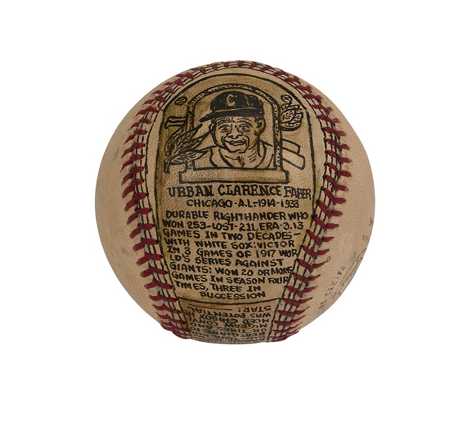 No one could decorate a baseball better than George Sosnak, whose meticulous, artistic design is unrivaled. This beautiful example which is in excellent condition is culled from the artist's "Hall of Fame" series that featured Cooperstown plaques and stats. Urban "Red" Faber spent the entirety of his 20-year major league career with the Chicago White Sox and his many accomplishments are listed here in the recreation of his Hall of Fame plaque. Faber was the last legal spitballer in big league history.