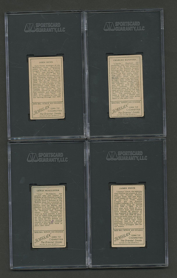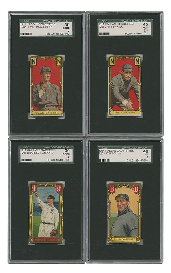 Collection of four T205 minor league cards include Frick SGC 35 VG+ 3.5, Dunn SGC 40 VG 3, Hanford Sgc #0 Good 2, McAlliaser Sgc 30 Good 2,