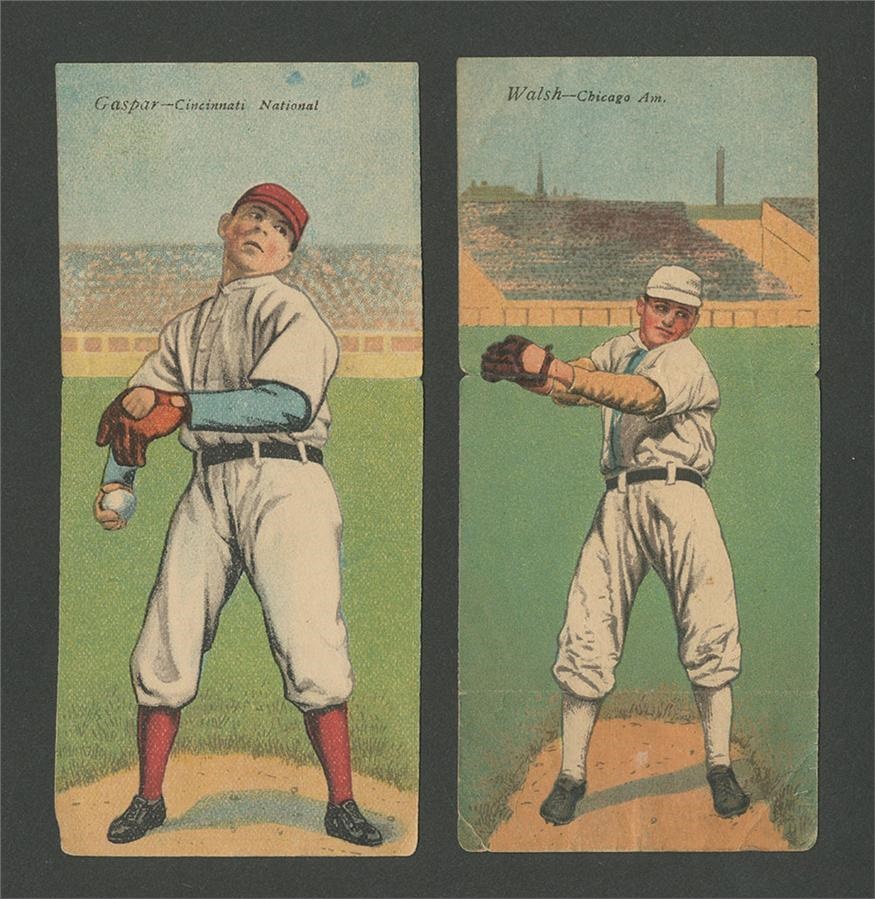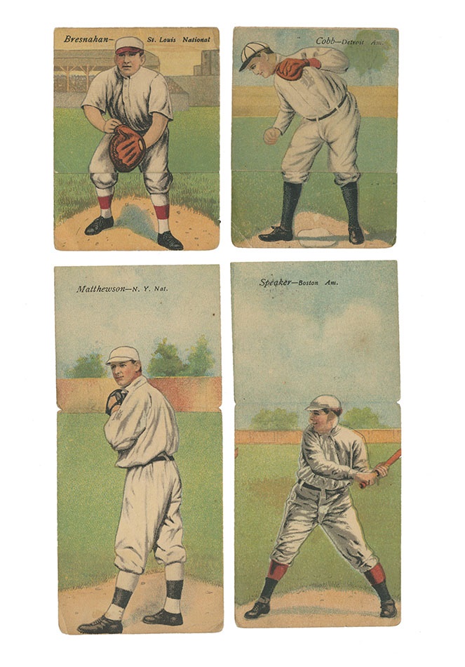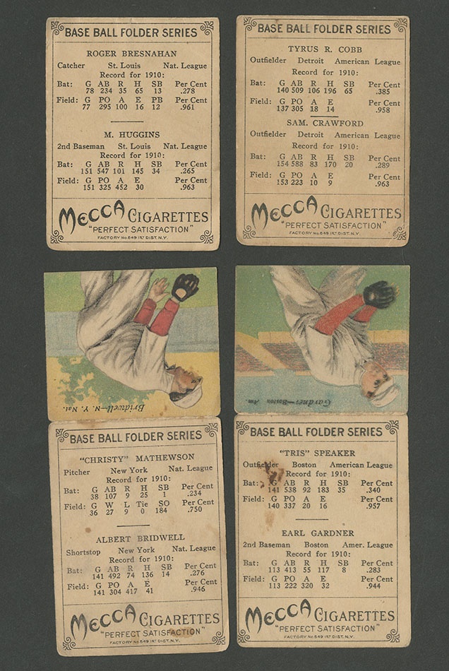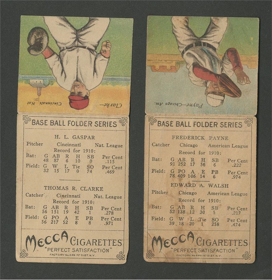 The 1911 T201 Double Folder set had an innovative design with full players that could be folded over to make a second player utilizing the same legs. Included in this group are: Cobb/Crawford G-VG, Speaker/Gardner VG, Bresnahan/Huggins VG, Gaspar/Clark GD, Payne Walsh GD and Mathewson/Bridwell GD/VG. ;
