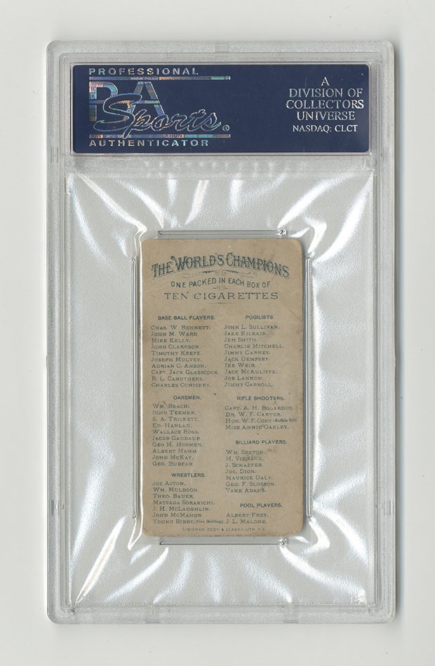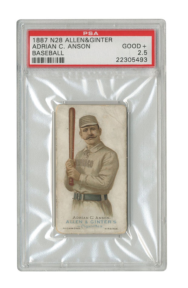 Probably the first great trading card set ever issued. In 1888, The Allen & Ginter Tobacco Company issued a set of 50 sports cards, entitled The World's Champions, Series One. This N28 set included 10 baseball players, plus oarsmen, wrestlers, pugilists, rifle shooters, billiard players, and pool players. Besides the hard-to-find baseball cards, John L Sullivan, Miss Annie Oakley and Buffalo Bill Cody are favorites among cigarette card collectors. These wonderful cards were inserted into Richmond Straight Cut slide-in-shell packets of 10 cigarettes. Offered is The Cap Anson card professionally graded by PSA 2.5 Good +