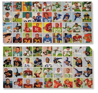 There are 36 cards on each sheet for a total of 72 cards. The first sheet contains cards 1-36 of the set. This sheet has rookies of Y.A. Tittle and Lou Groza and stars such as Glenn Davis and Joe Perry. Overall this sheet technically grades Vg/Ex to Ex but presents even better. The reason for the grade is one of the corners, on the #9 card, has been torn off. The top of the sheet has a crease through the Tittle & the #4 card. The Lou Groza is stained at the top. The second sheet contains cards 109-144 of the set. This sheet has stars such as Charlie Trippi, Chuck Bednarik, Pete Phios, etc. Overall this sheet grades slight-ly better than the first sheet. The bottom right corner of the sheet, card #144, has a slight loss of paper. There is one minor crease at the top of the sheet but other than that it looks great. Both of these sheets exhibit deep, bold colors and would display quite nicely.