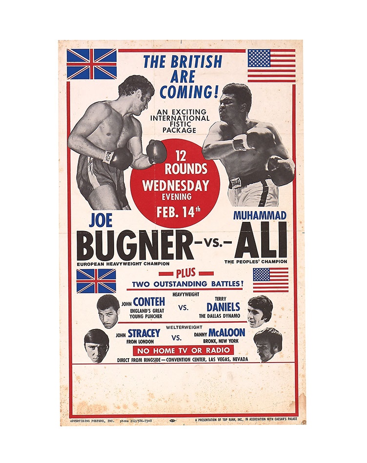 On February 14, 1973 at the Convention Center in Las Vegas former world heavyweight champion Muhammad Ali continued his comeback from his loss to Joe Frazier in 1971 by meeting European Heavyweight Champion Joe Bugner. Ali prevailed winning a unanimous 12 round decision over the tough Bugner. Offered here is an original closed circuit poster used for advertising the theatre viewing of this fight. This poster is paper picturing the fighters and is mounted on board. Exhibits heavy staining and soiling. 14" x 22."