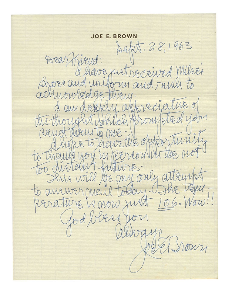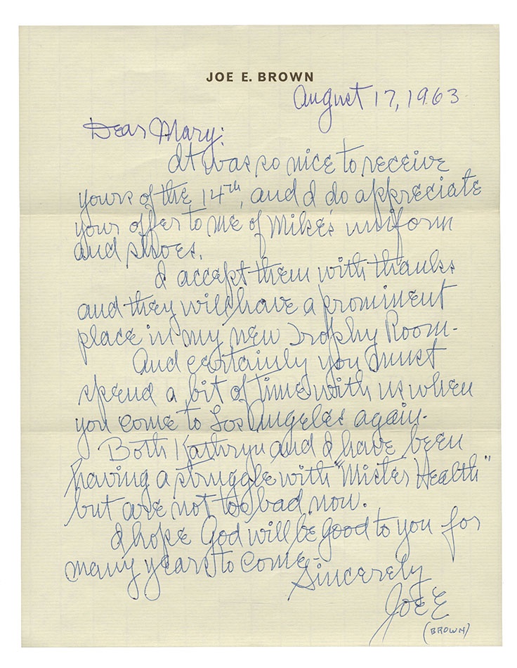 He may be best-known for his famous line "Well, nobody's perfect" line in the 1959 comedy classic "Some Like It Hot," but Joe E. Brown was one of the premier comedians of the 1930s and '40s, and, it may surprise some, was one of the first big collectors of game-used baseball memorabilia, as these letters to Hall of Fame catcher Mickey Cochrane's wife attest. Both are handwritten a year after Mickey passed. Mrs. Cochrane, knowing that Brown was a collector, offered Mickey's uniform and spikes, and Brown graciously accepts them for his trophy room. One letter is signed "Joe E" with Brown printed and the other is signed "Joe E. Brown." They both show wonderful insight from and early collector who happened to have been a celebrity.