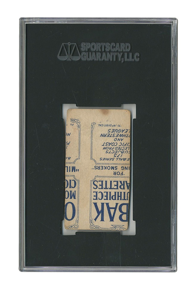 Pacific Coast League issue is scarce rare due to its local nature. Regional issue has severe miscut to the back. 60% off center, card itself grades VG. Premium from Obak Cigarettes in 1910.