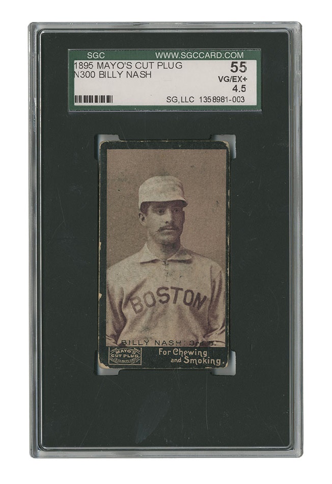 Issued In the Mid 1890s, Mayo Cut Plug baseball cards have grown increasingly popular with their real photo format and black borders. Offered is Billy Nash graded SGC 55 VG-EX + 4.5. It has a strong image and a clean back with appropriate wear to the corners.