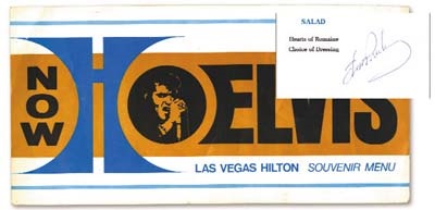 Attractive 7x14" menu shows the King on the cover blowing one out. Inside full dinner menu is perfect blue ink signature of Elvis signed that night. Great advertising for his "Latest Albums" and Elvis on Tour film on the verso. Menu itself is VG-EX.