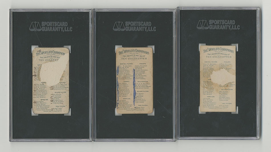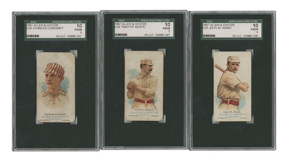 One of the most graphically inspiring baseball card sets of all. Three Hall of Fame baseball cards from the 1887 Allen & Ginter N28 World Champions Set. Group Includes John Ward, Charles Comiskey, & Tim Keefe all Sgc 10 PR 1. The fronts are all VG the reverses have various degrees of back damage.