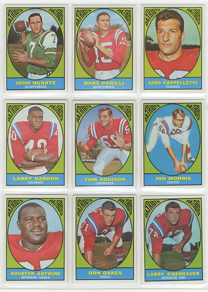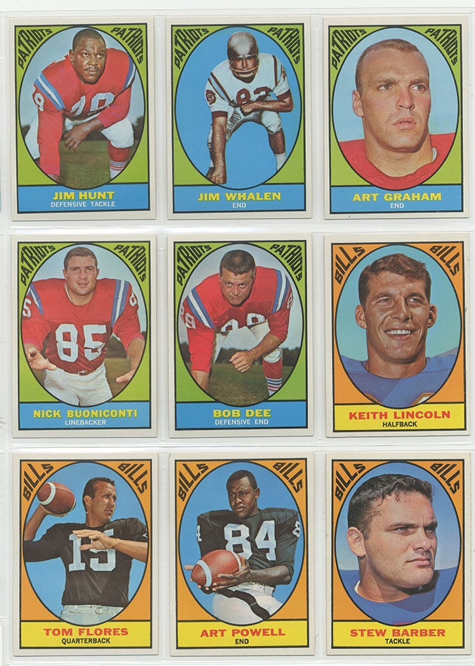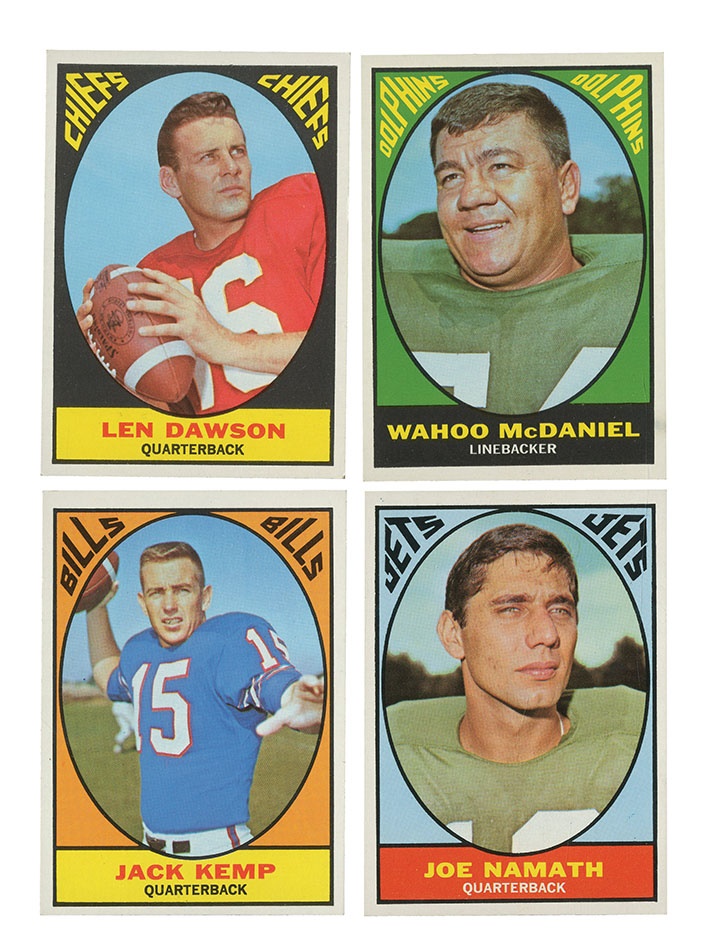 This popular Topps issue marks the third year that they issued an AFL set. Its bright colors and lettering style represents the late 1960s culture well. The set grades as follows #1 EX-MT, #24 Kemp NRMT #61 Dawson EX+,#82 McDaniel NM-MT, #98 Namath MINT, #106 Biletnikoff NRMT, #123 Alworth NRMT, #132 Checklist EX. The Rest of the set averages NRMT+ with many high-grade examples.