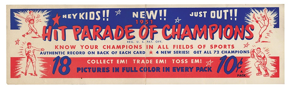 Never-before-seen 1951 Berk Ross Hit Parade of Champions window advertising sign . This red, white and blue sign features players from baseball, football, boxing & hockey. It measures 16" x 5 5/8" and was inserted into display boxes. The paper poster is in excellent condition except for the unavoidable factory fold in the center. A great series which is somewhat weighted toward the New York teams and the east coast.