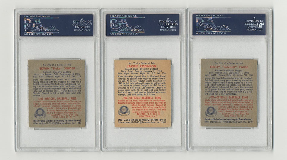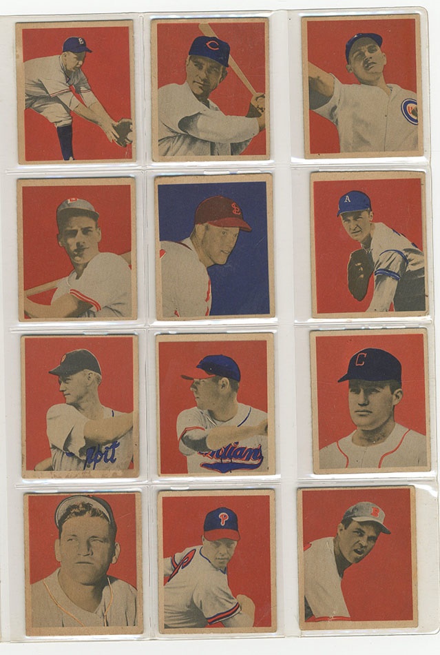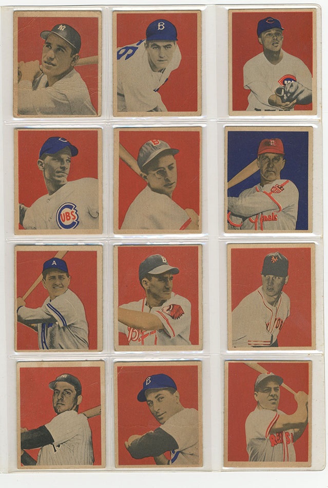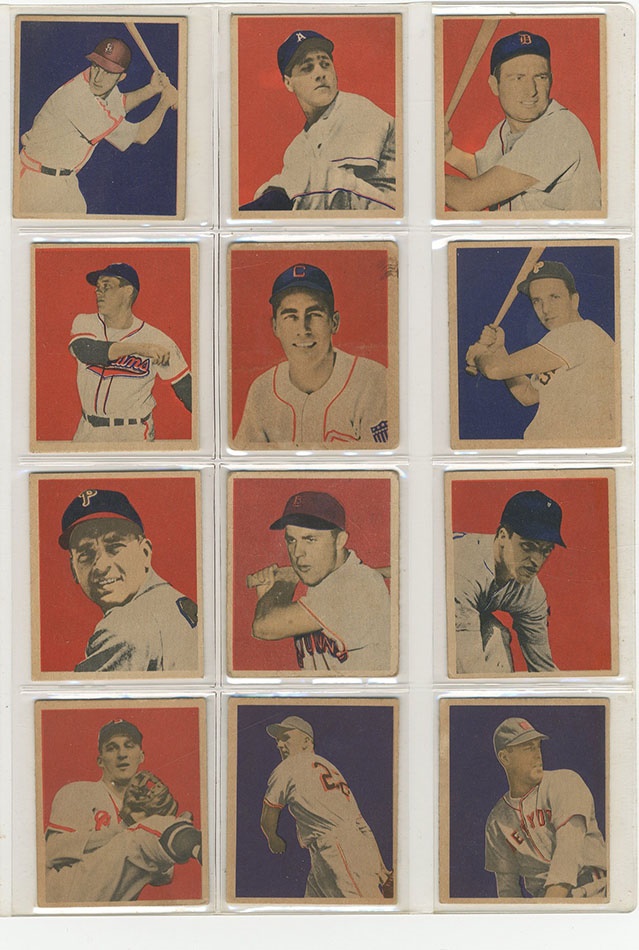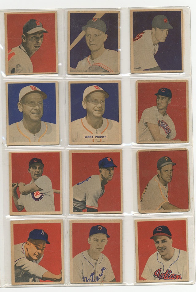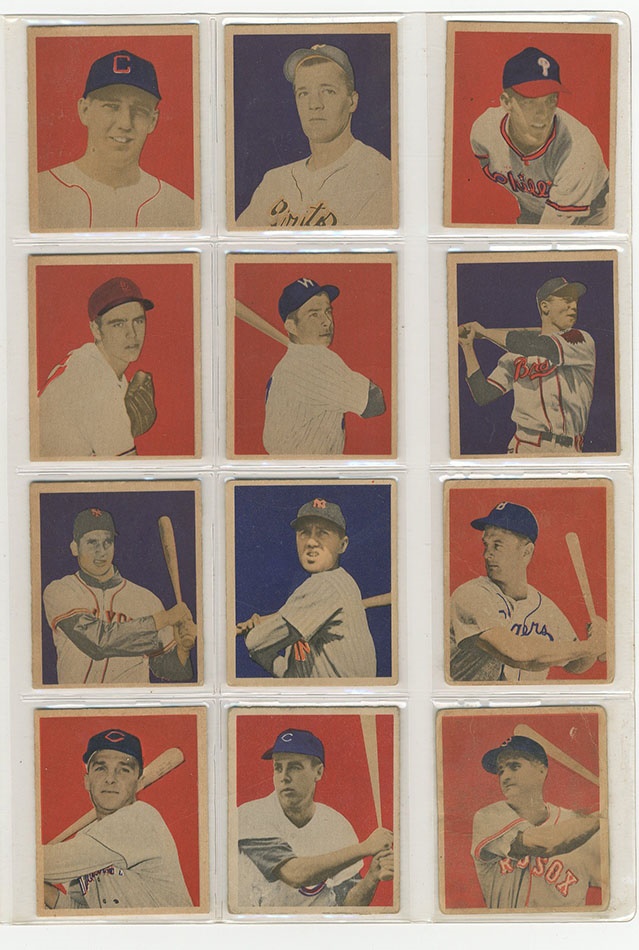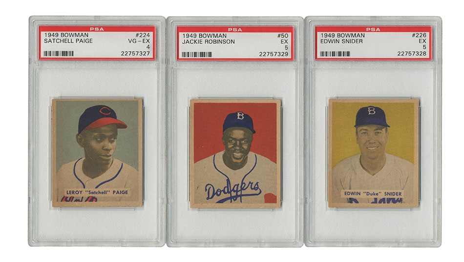 This recently resurrected set of cards was built in the 1980s and stored untouched for the last 30 years. In 1949, Bowman expanded its baseball roster to 240 subjects and added color to its cards. With the expansion came the first cards of many key rookie cards including Jackie Robinson, Duke Snider, Roy Campanella, Satchel Paige and others. Key cards grade:#24 Musial Ex, #27 Feller EX, #33 Spahn EX, #36 Reese EX, #46 Roberts VG, #50 Robinson PSA 5 EX, #60 Berra PR, #84 Campanella EX+, #85 Mize EX, #98 Rizzuto EX, G, #100 Hodges EX, #214 Ashburn NRMT, #224 Paige PSA 4 VG-EX, #226 Snider PSA 5 EX, #233 Doby EX, #238 Lemon EX. The set is a consistent EX throughout with some nicer cards throughout. Several variations are included such as the Phil Rizzuto. The PSA-graded cards present nicer than the grades indicate so bid accordingly.