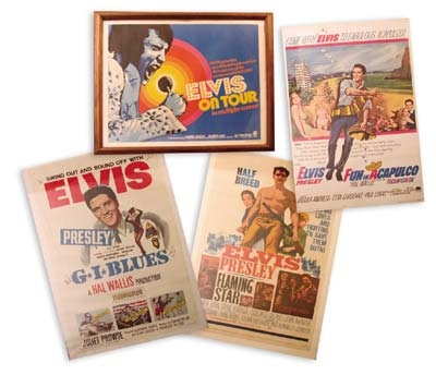 Fine collection are all nicely framed: 1) Elvis on Tour half-sheet (1972). Great filmed concert poster looks like an old boxing style. 2) Fun in Acapulco (1963). One-sheet is all chicks in bikinis. Politically incorrect, but who cares. 3) GI Blues 1-sheet. 1960 film poster mounted on linen with great image of the King dominating the mise-en-scene. 4) 1960 Flaming Star 1-Sheet. A bare-chested Elvis is one sexy man. Overall NRMT.