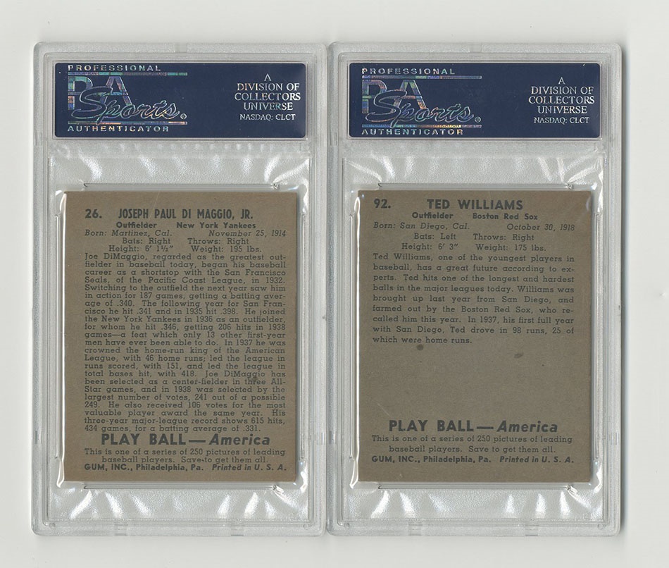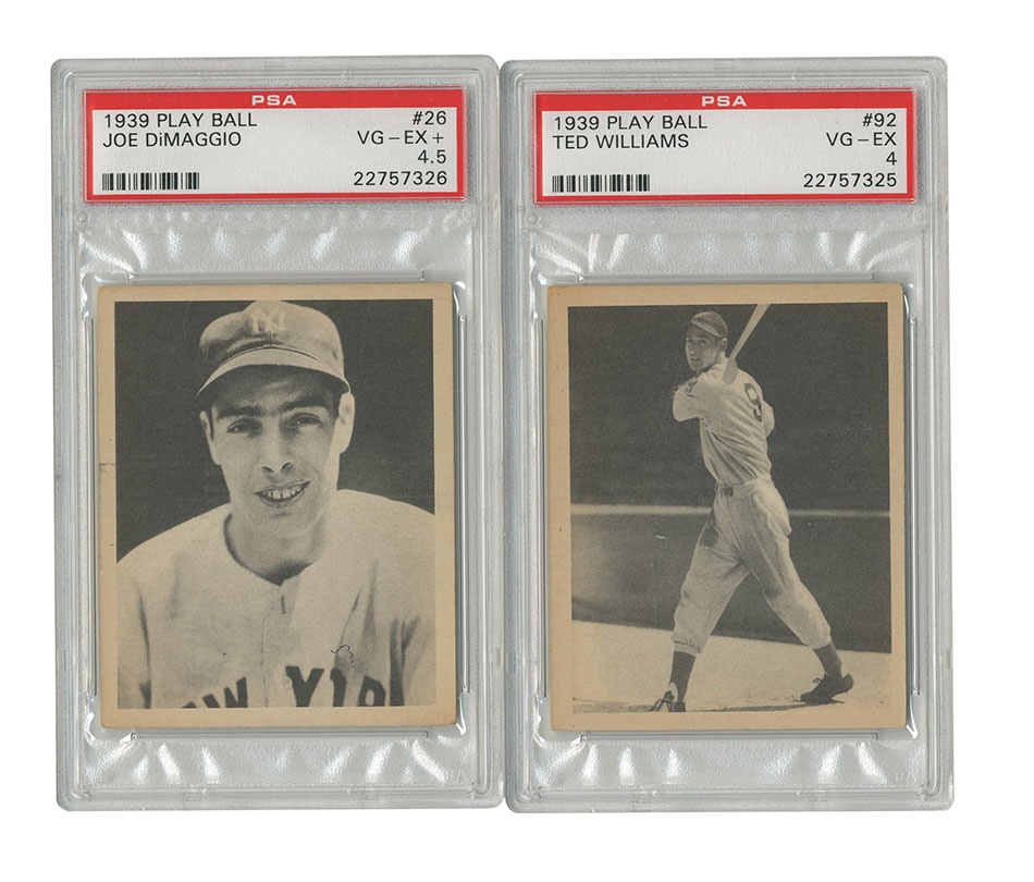 1939 marked the first issue of Playball Gum and the result was one of the most important sets ever issues including the coveted rookie card of Ted Williams. 162-card black and white beauty also came with myriad stars including Joe DiMaggio. The key cards grade: #26 DiMaggio PSA 4.5 VG-EX+, #48 Gomez EX, #50 Gehringer EX, #51 Ott EX, #56 Greenberg EX, #92 Williams PSA 4 VG-EX. The set itself grades EX overall and is consistent throughout. This is a great set that is fresh to the market from an old-timer and has never been messed with. Bid with confidence.