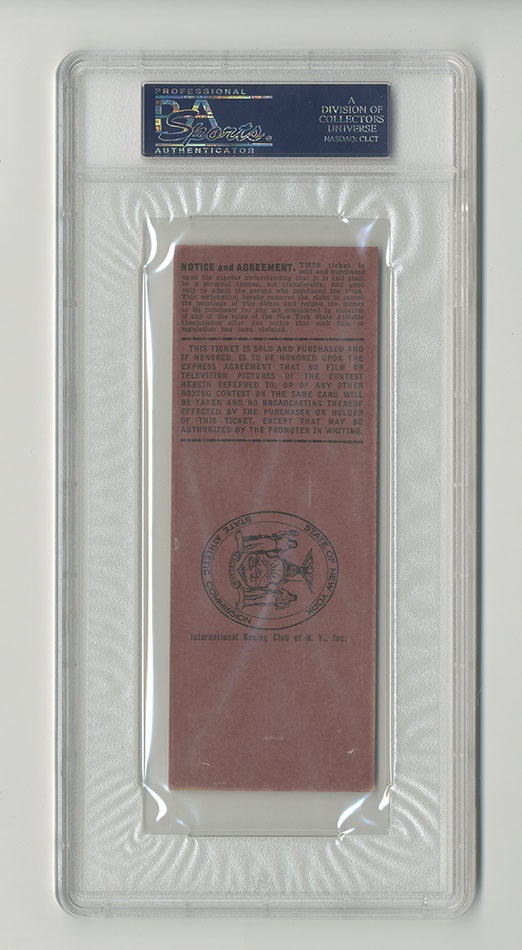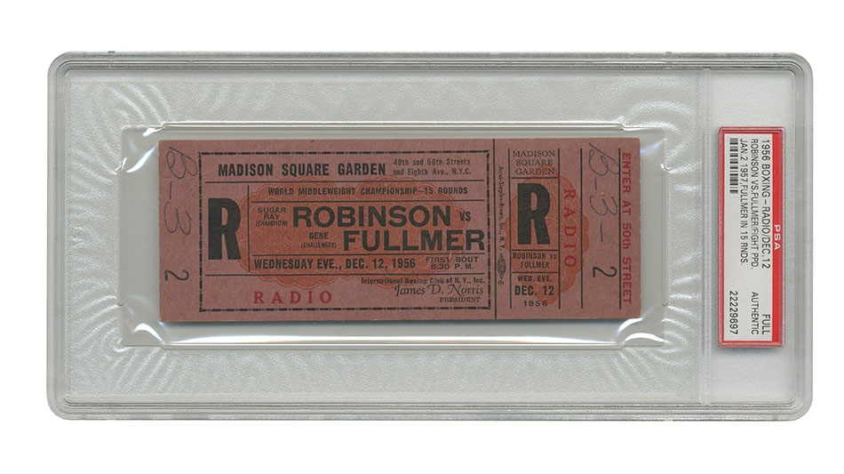 On January 2, 1957 at Madison Square Garden in New York middleweight champion Sugar Ray Robinson defended his title against tough Gene Fullmer of Utah. Fullmer won a unanimous 15 round decision and the title. The fight had been scheduled for December 12, 1956, but was postponed for three weeks. Offered here is an original, full, unused ticket for this event. This full ticket names the fighters and has a section, row and seat number. Bold color and print. Some soiling and creasing. Overall VG condition. PSA/DNA authenticated.