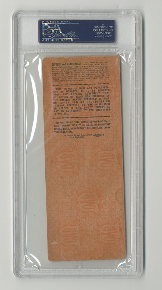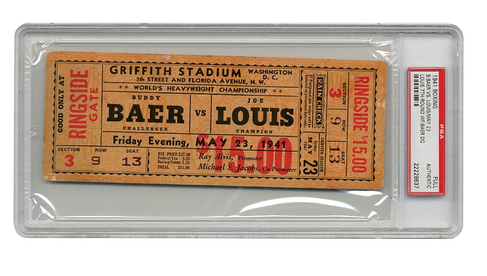 On May 23, 1941 at Griffith Stadium in Washington D.C. heavyweight champion Joe Louis fought contender Buddy Baer (brother of Max) for the first time. Louis won the fight by disqualification in round seven. Louis was down in first, but Baer was down three times in sixth. The last knockdown of Baer was after the bell, according to Baer's manager, who then refuses to leave the ring, upon which Baer is disqualified. Offered here is a scarce, full, unused ticket for this event. This full ticket names the fighters and includes a section, row and seat number. Bold color and print. Not creased or torn. Generally clean. Minor edge and corner wear. Overall EX condition. Authenticated by PSA/DNA.